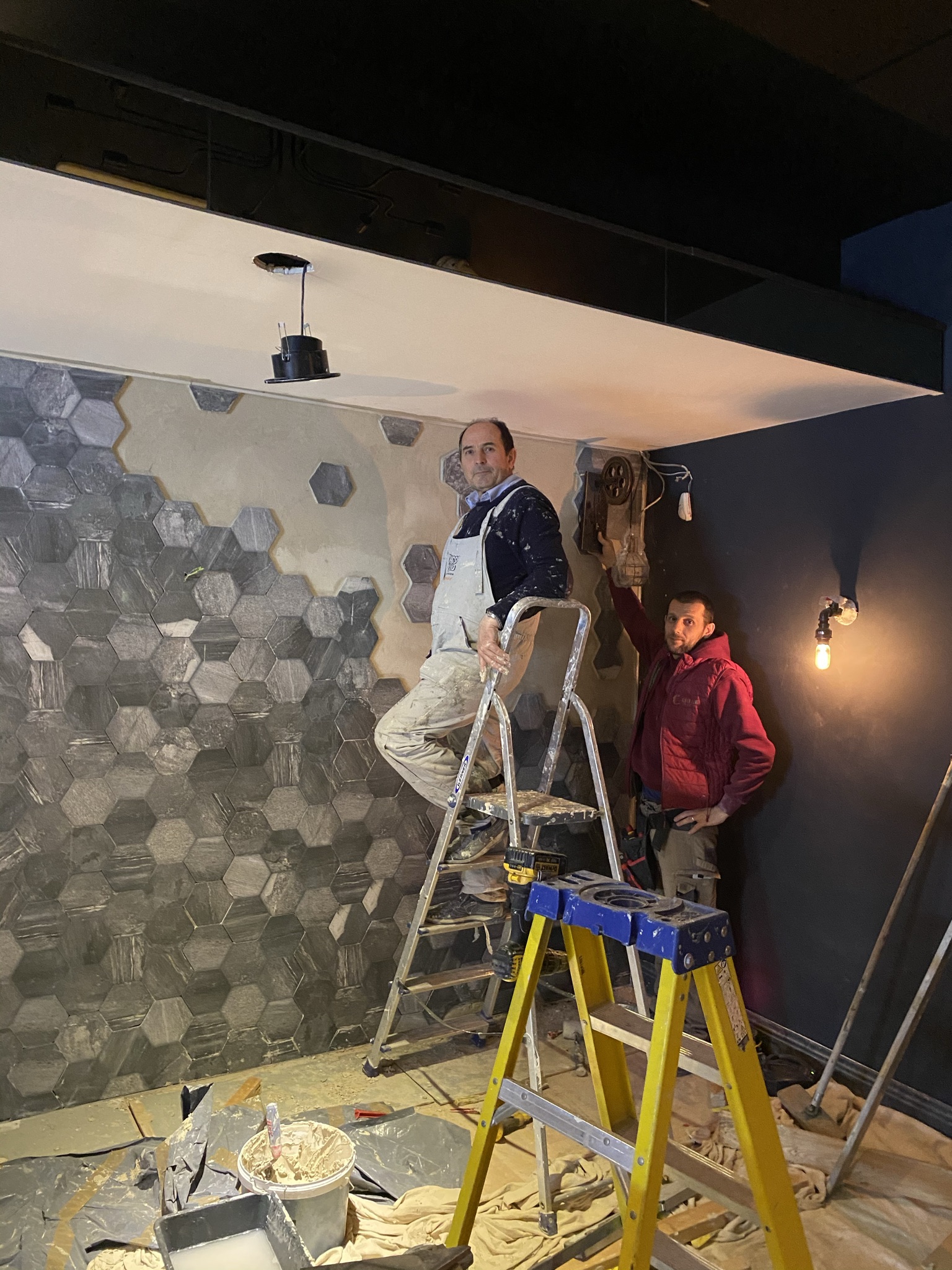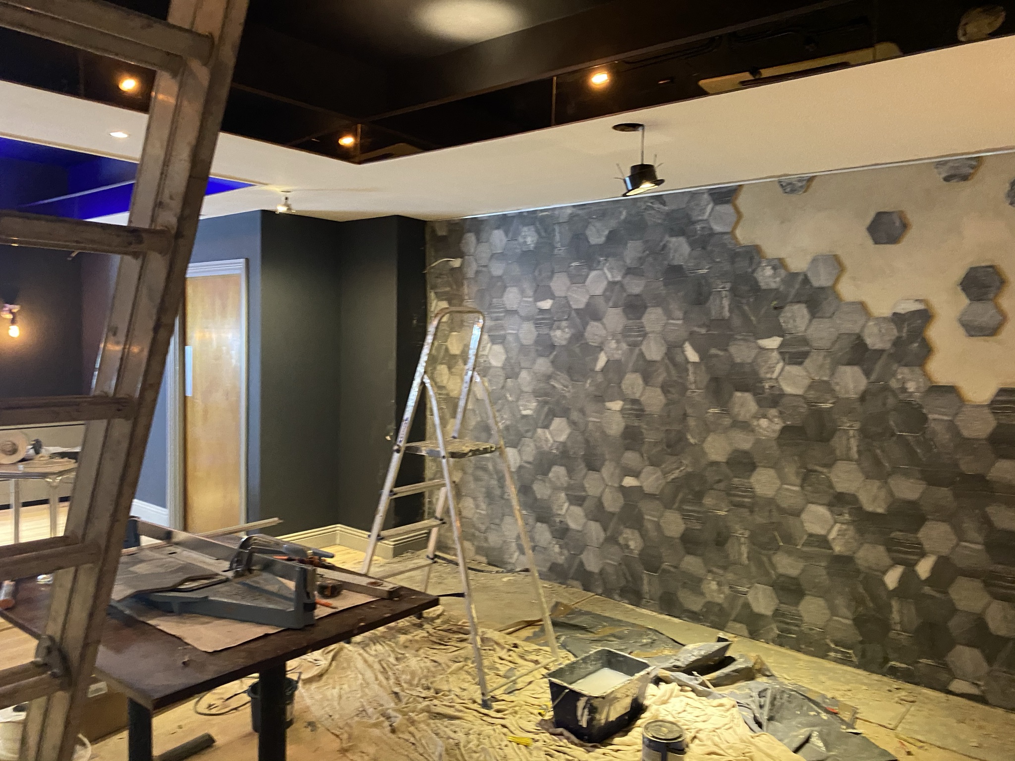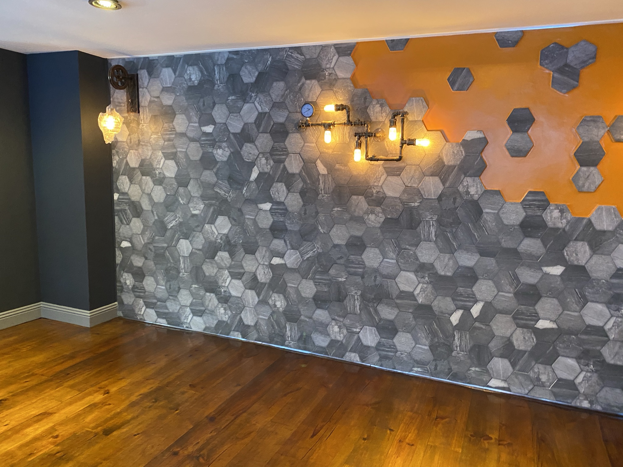 • Hexagonal Walls: The walls are designed with hexagonal patterns using ceramic coatings that have a concrete effect. This not only adds texture and visual interest but also ties into the industrial theme.